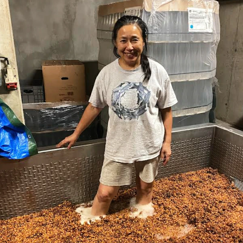 収穫したゲヴェルツトラミネールを畑の中で直ぐに手でつぶし、そのまま醸造所に持ち込み、平たいステンレスの容器に漬込み、毎日足踏みの新井さん(写真)。